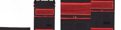 Oxford Satchel bag with flap and shoulder strap,PVC holder and clip closure,Front name card holder,9 inner utensils holder with velcro and zip closure for safety,8 exact utensils holder,1 big outer pocket with zip closure,Inside has 1 ipad pocket, 2 mesh pockets, 3 pen inserts and 4 business card holders,New design with contrast red colour